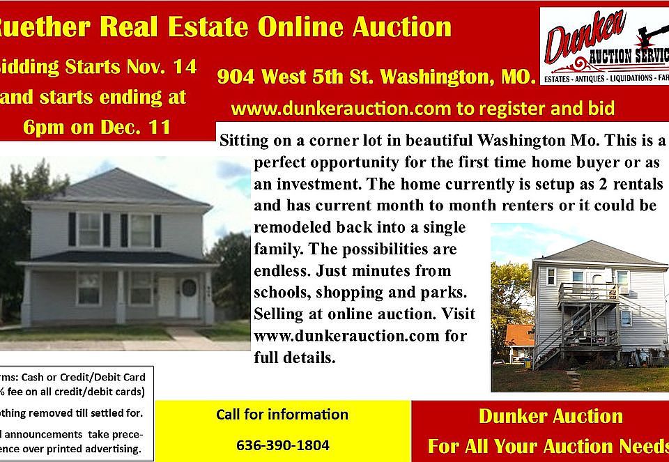 Sitting on a corner lot in beautiful Washington Mo. This is a perfect opportunity for the first time home buyer or as an investment. The home currently is setup as 2 rentals and has current month to month renters or it could be remodeled back into a single family. The possibilities are endless. Just minutes from schools, shopping and parks. Selling at online auction.