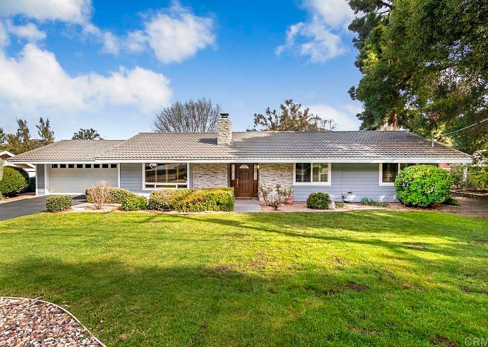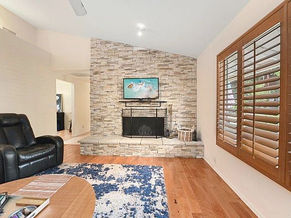 This charming single-story home is sure to win you over from the moment you arrive. Nestled right against the Castle Creek Golf Course, you'll enjoy sweeping views of lush fairways and serene greenery—right from your own backyard. Step inside to a spacious living room featuring vaulted ceilings and a cozy wood-burning fireplace with elegant stacked stone veneer, creating a warm and inviting atmosphere. The classic kitchen offers double ovens, rich cabinetry, a breakfast bar that seats four, and—yes—more stunning golf course views. Open to the kitchen, the dining area flows seamlessly outdoors through a large sliding door, leading to a generous backyard with mature trees, built-in planters, and plenty of space to design your dream outdoor retreat. Whether it’s a pool, garden beds, or an outdoor kitchen, this yard can accommodate it all. The expansive covered patio with Alumawood cover is ideal for year-round entertaining. The oversized primary suite features an ensuite bath complete with dual sinks, a vanity area, and a large shower stall. With easy and convenient access to Hwy 15, commuting or exploring the county couldn’t be easier. This home truly offers the best of both worlds—peaceful golf course living with great connectivity.
