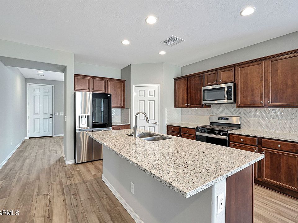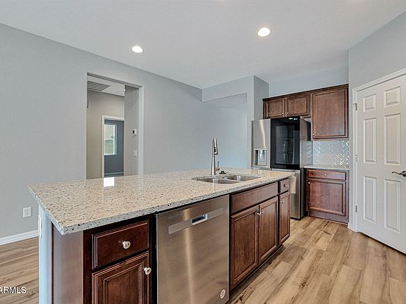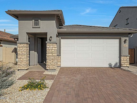 Step into modern living with this beautifully designed 1,730 sq. ft. home that perfectly combines style and practicality. Boasting 3 bedrooms, 2 bathrooms, a den, and a luxurious master suite with a walk-in closet, stand-up shower, and soaking tub, every detail is thoughtfully crafted. Enjoy the low-maintenance landscaped backyard and the convenience of a Tesla charger in the garage.Located minutes from Loop 101, State Farm Stadium, and Westgate Entertainment District, you'll love the vibrant surroundings. The community adds even more with a pool, basketball court, ramada, and scenic trails.