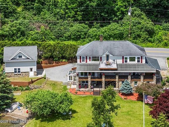 LG Lakefront & In-Town Living! Hard to find both. This beautiful home is being offered after 38 years of enjoyment. Spacious w/ lakeside dining, swimming from a sandy beach, boating, lake & island adventures. Walk to Hague stores, parks & events. Each floor has 2 BR, 1 BA, kitchen, dining, LR & porch—perfect for family space and rental income potential. Stone & hardwood features throughout. Main floor opens to a large covered porch w/ views of a level lawn, 160' lake frontage & Hague Bay's mountain vistas. Includes walkout basement, greenhouse, shed & separate garage with large room above, providing lots of potential. A spacious U-shaped Cumaru dock w/ crib construction holds 6+ boats & jet ski lift. Come make this YOUR lakeside home where every day feels like a vacation!