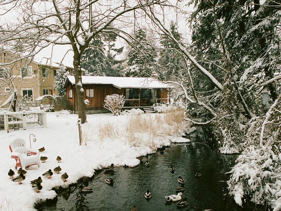 Tired of urban life? Come live at this humble cabin at the foot of Lake Washington. Only 15 min from downtown Seattle, this retreat has all kinds of natural wonders. A creek runs through the front yard, filled with turtles, crayfish, ducks, herons, and river otters. A public park sits right outside the front door where you can lounge, play basketball, or frolic in the lake. There is easy access to the Burke Gilman bike path, as well as a brewery and gym 5 min away at Magnusson park. This is the kind of place for someone who loves nature and wants to integrate it more into their life. There is a wood-burning stove for cozy fires in the winter, as well an outdoor mobile fire pit for gatherings in the summer time. There's a hidden projector screen stored behind a beam in the dining area that pulls down to be a 120 inch television. It's like a little cabin cinema. We wake up every day happy here and are sure you will too!