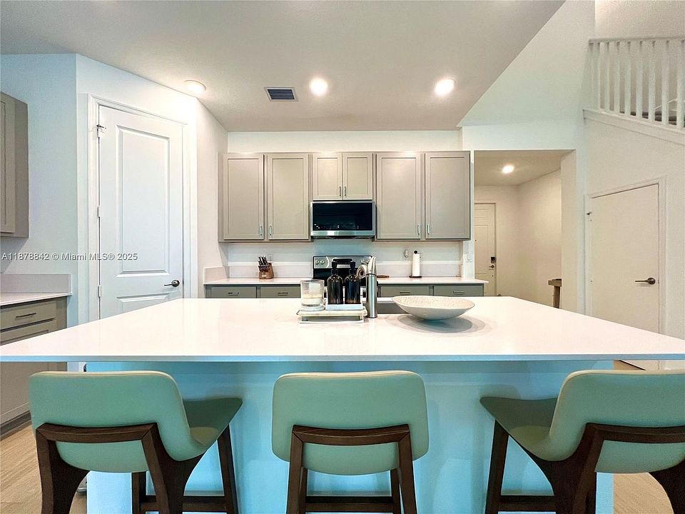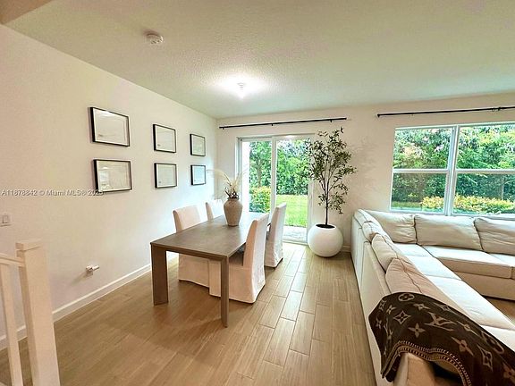Quick move-in :) This LARGE LUXURY townhome comes with a wide foyer and open layout. The soaring 24 ft ceiling above the staircase, wood-look plank tile floors, wood cabinetry ,QUARTZ counter tops and STAINLESS STEEL appliances create a beautiful upgraded space. All 3 bedrooms are upstairs with a large laundry room. Lots of storage throughout. Impact windows & Doors & backyard space for your convenience. LAWN CARE included! This a secure community with GATED ENTRY. Other amenities include pool, gym, bbq area etc. Check out the schools! :) 2 min away from the Turnpike. Easy access to shopping & dining!