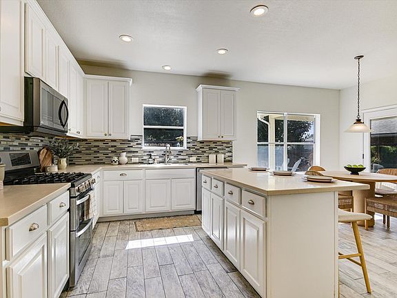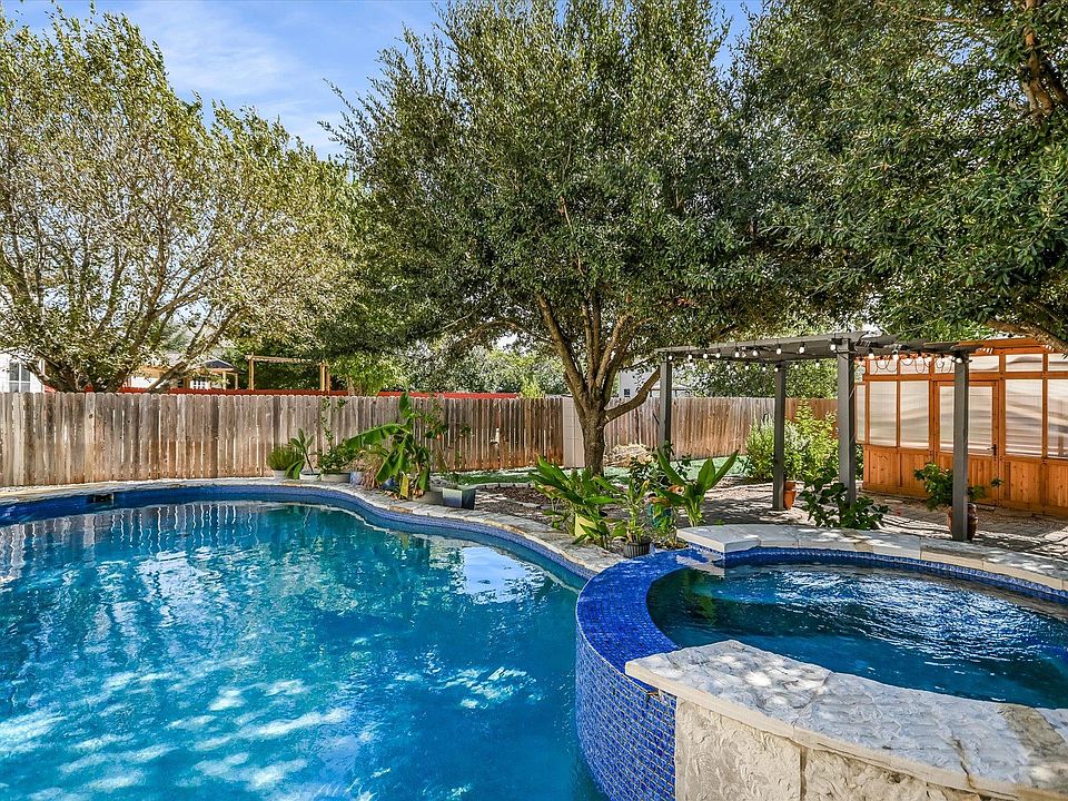 This inviting 5-bedroom, 3-bath home offers flexible living spaces and an *incredible* backyard retreat!! Downstairs, enjoy multiple gathering spaces including a formal dining room, a sitting room (currently shown as a study), & a family room with fireplace that opens to the kitchen & breakfast area. The kitchen features an island, SO much pantry storage & generous counter space for everyday living and entertaining, plus a dedicated breakfast area. A downstairs bedroom + full bath offer flexibility for guests, home office, or multi-generational living. Ceramic wood-look tile throughout the main level combines style and durability. Upstairs, the expansive primary suite features two closets and plenty of room to unwind. Three additional bedrooms share a full bath, and a large family/playroom provides the perfect spot for games, movies, or home gym. Engineered bamboo flooring runs throughout the upstairs for a warm, modern touch. The star of the show is the backyard private retreat - step outside to enjoy the oversized lot with sparkling pool, hot tub, pergola, greenhouse & covered patio. This backyard is anything but cookie cutter, offering space to relax, garden, & entertain year-round.