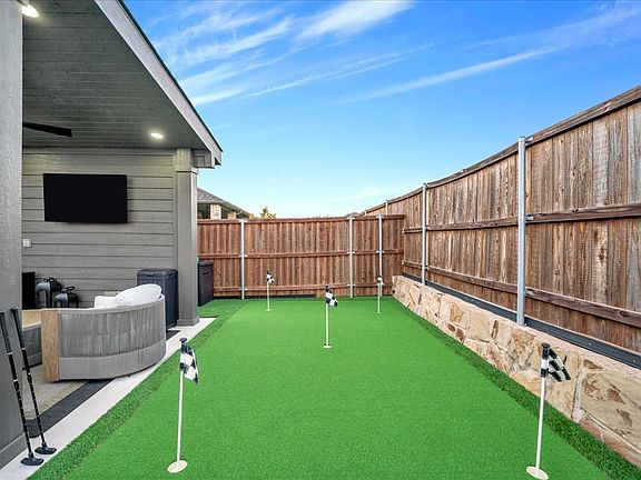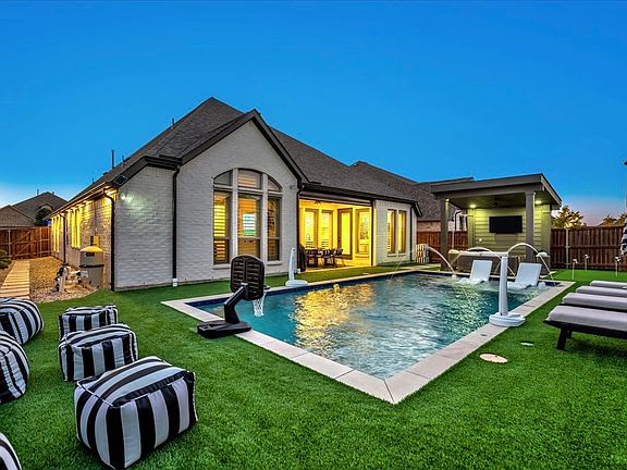 Why buy a new build when you can have better than new...complete with a pool, putting green, and upgrades already done?! Built in 2020 by Perry Homes, this immaculate 1-story offers 4 bedrooms, 3 full baths, and a versatile flex room designed for modern living. Enter the home and be wowed by soaring 11 ft ceilings, plantation shutters, designer lighting, 8 ft doors, and matte black hardware throughout. The kitchen is a showstopper with quartz countertops, a gorgeous backsplash, 5-burner gas cooktop, pot & pan drawers, a single-basin Silgranit sink, upgraded pendant lighting and chandelier. The open living space centers around a sleek tiled gas fireplace and a 65 inch Samsung Frame TV that conveys. Your primary suite feels like a spa retreat with a freestanding soaking tub, walk-through shower, dual vanities, and two walk-in closets. The flex room is currently a media room with a 100 inch projector screen and surround sound that can convey but could easily transform into a study, gym, playroom, or formal dining. Outside, your private oasis awaits: sparkling in-ground pool, putting green, artificial turf, concrete pavers, covered patio with motorized shade, covered pergola-both with TVs, plus app-controlled LED lighting that sets the perfect vibe for entertaining. Extra touches elevate this home including a gas stub for grilling, built-in mudroom bench, Govee lighting in front, concrete garbage pad, epoxy garage flooring with overhead rack, and salt-finish driveway. Conveying items include washer & dryer, 2 pool loungers, tv's, and more. Located in the master-planned Sandbrock Ranch community with walking trails, dog park, and quick access to PGA Frisco, The Star, Legacy West, and DFW Airport. Seller will include 6 months of pool service for a closing by Dec 31! Experience the perfect blend of luxury, leisure, and lifestyle, all waiting for you!