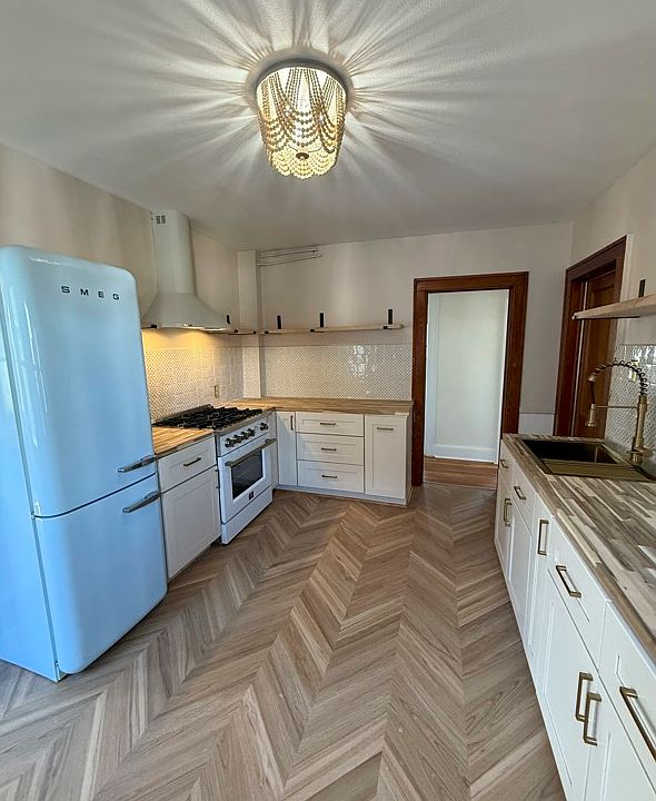 MORE PHOTOS COMING SOON! Get cozy in this Amalfi coast styled three bedroom/ one bath apartment located on the second floor of a three family multi family. The newly renovated kitchen features butcher block countertops, all new cabinetry with floating shelves for displaying your personal treasures, and unique appliances that feel more like a stay away on vacation than your average rental kitchen. The pantry features some updated storage cabinets and has enough space for your own washer dryer set in unit. The designated dining room is perfect for family dinners and hosting your friends in a special way with all new lighting and wall paper. The living room accounts for sectional furniture and boasts a working fireplace for cozy holidays coming up. The unit has three bedrooms with their own closets and a linen closet for all of your bathroom storage. Forget shoveling this winter and enjoy off street parking featuring two parking spaces one of which is your own garage bay. Each unit has its own private porch for extra storage or summer hangs.