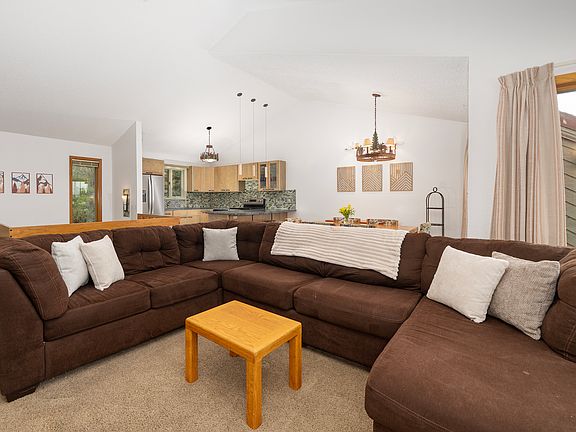 Fully furnished townhouse style 2-story condo: 2 bedrooms + futon bunk in lofted den, 1,390 finished square feet with no neighbors above or below. All new appliances with laundry in-unit, modern kitchen, and recently updated bathrooms with high-end finishes and rain showers. En suite master bath has radiant heat floors and Toto bidet. Open great room + kitchen + dining with vaulted ceilings and wood burning fireplace for cozy nights. Recently painted. Currently, primary bedroom has king bed, second bedroom a twin (will be swapped for a queen unless renter has other preference), and den has full size futon with a lofted single.