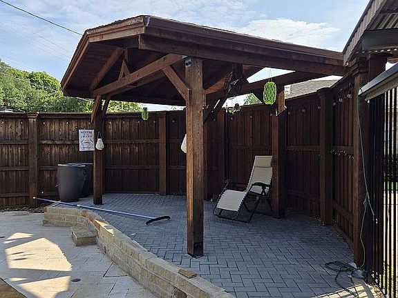 2021 August: Raised paver patio and pergola constructed, paver patio and fence by house constructed.