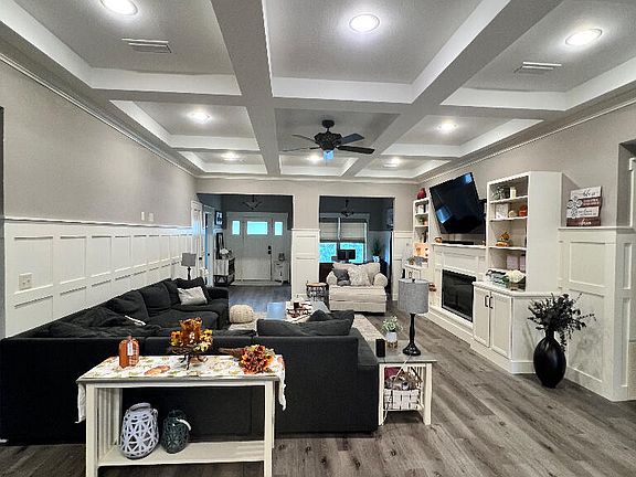 Gorgeous 4-bedroom 3-bath home, 2-car garage on a 1/3 acre lot. Coffered ceiling in living room, electric fireplace, hard wired surround sound (also on porch), board & batten wainscoting in common areas, split floor plan featuring a Jack & Jill bathroom. Kitchen features granite countertops, double wall oven, wine fridge, built-in electric cooktop top, large stainless steel drop-in sink, tray ceilings, eat-in breakfast nook, walk-in pantry as well as a walk-in utility room off the kitchen. Soft close cabinet doors/drawers. Vinyl plank flooring throughout with ceramic tile in bathrooms. Huge master bedroom closet with custom shelving. Walk-in master shower, separate jacuzzi tub, double vanity and an additional vanity sitting area. Large walk-In closets in other rooms.Irrigation system.