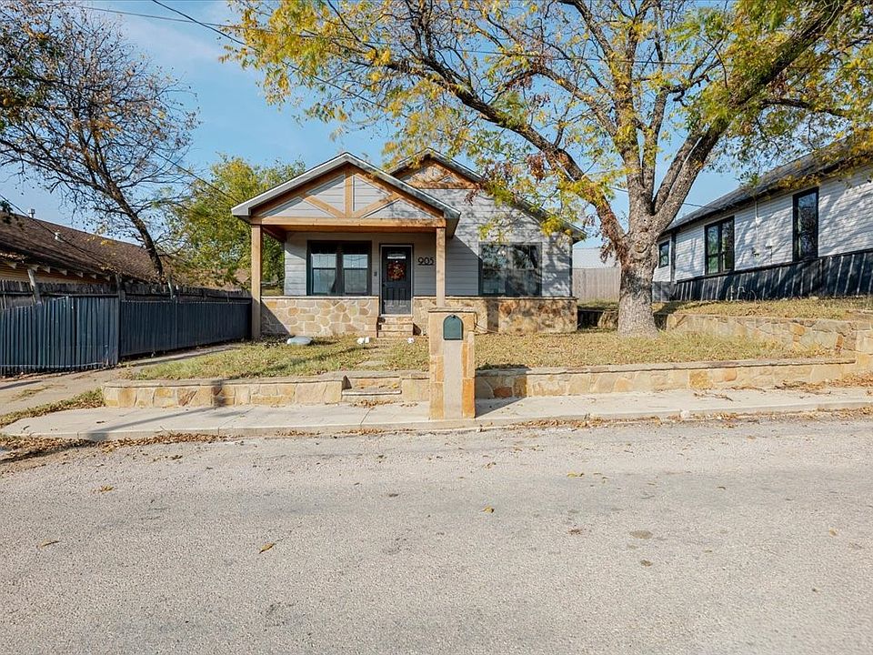 Charming and move-in ready 2 bedroom, 1 bath home with a view of the historic Baker Hotel. Fully remodeled a couple years ago with quality finishes and construction including a spray-foamed attic. Custom stonework from the mailbox to the front apron creates great curb appeal. Inside features an open concept layout with a large kitchen island that serves as the dining area. Bedrooms are split by a stylish bathroom with marble tile flooring, granite countertop, and a custom-tiled tub surround. Located just one block off Hwy 180, offering easy access to all of Mineral Wells. Close to dining, shopping, healthcare, and the excitement of downtown. A clean, updated, and convenient place to call home!