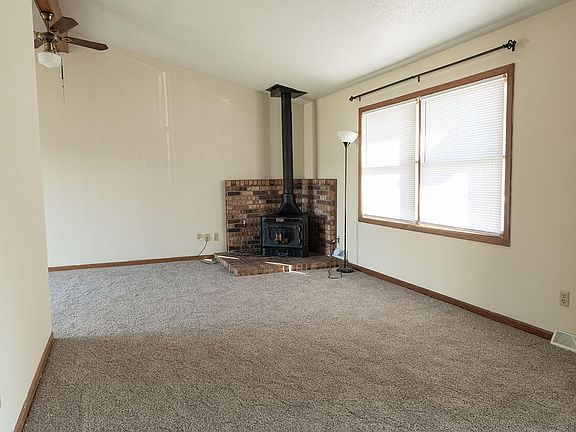 The main level features a bright living room with a wood stove, a dining area that walks out to the backyard, and a practical kitchen setup. Upstairs, you'll find all three bedrooms, both full bathrooms, and a convenient laundry closet. The primary bedroom includes a private bath and a walk-in closet.