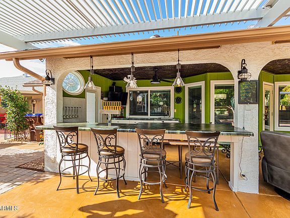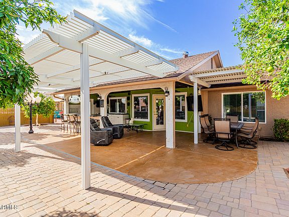 RARE FIND! One-of-a-kind outdoor living! This immaculately home features a welcoming front courtyard and a truly spectacular backyard designed for both relaxation and unforgettable entertaining. Enjoy five pergolas (three powered, two manual), a built-in bar and outdoor cooking area, above-ground spa, fruit trees, upgraded block walls, low-maintenance landscaping, and two side gates — a private retreat you'll love year-round! Inside, you're greeted with a split floor plan, walk-in closets in both bedrooms, and top-to-bottom improvements including new energy-efficient windows, new front door & screen door, new garage door, new tile flooring, new ceiling fans throughout, boxed-in soffits, solar screens, and a new water heater...and more!