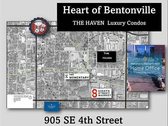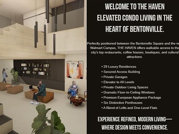 Luxury condo living at its best, welcome to THE HAVEN BENTONVILLE. Perfectly positioned between the new Walmart Campus and the vibrant Downtown Bentonville Square, The Downtown Haven offers unmatched access to cultural hotspots. This is urban living redefined. This community features 29 luxury residences. Unit 110 – The Basquiat Flat, is named in tribute to legendary artist Jean-Michel Basquiat—whose work is prominently featured at nearby Crystal Bridges—this ground-level unit channels a bold, industrial vibe with an artistic edge. A unique glass-paneled overhead door opens directly onto your private patio, blurring the lines between indoor inspiration and outdoor ambiance. The primary suite features a large walk-in closet. This one bedroom also boast a bonus flex space perfect for an work-at-home office. Whether you're an art lover, cyclist, entrepreneur, or someone who simply craves modern comfort in a walkable neighborhood—this is your Bentonville basecamp.