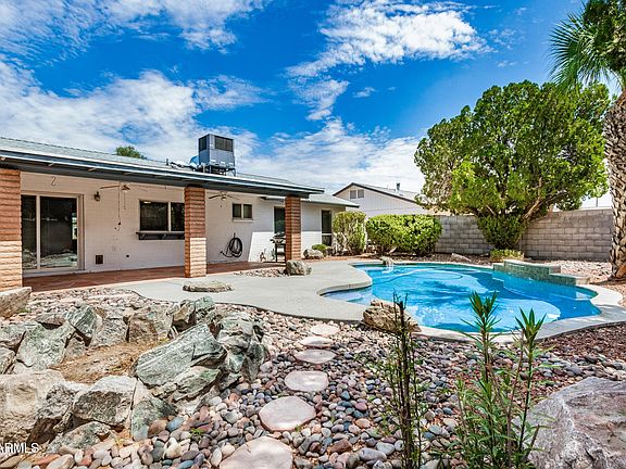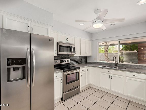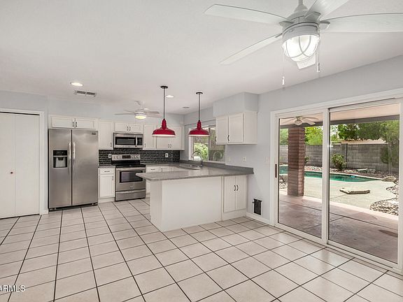 Embrace comfort and style in this delightful 3-bedroom home with a 2-car garage! Features include tile flooring, plantation shutters, ceiling fans, and full roof replacement in 2021. Perfectly flowing open floor plan has sliding glass doors to the back patio, ensuring a harmonious indoor-outdoor living experience. Spotless kitchen comes with recessed & pendant lighting, mosaic tile backsplash, stainless steel appliances, and a convenient breakfast bar. Large primary bedroom offers plush carpet, a walk-in closet, and a private bathroom with a step-in shower. As a bonus, a washer and dryer are included. Wonderful backyard boasts a covered patio and a refreshing pool, excellent for year-round enjoyment and entertaining. Don't miss this turn-key gem!