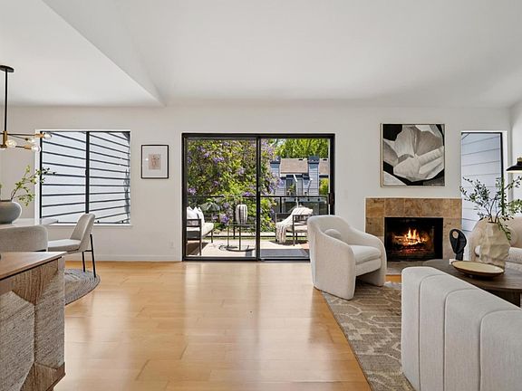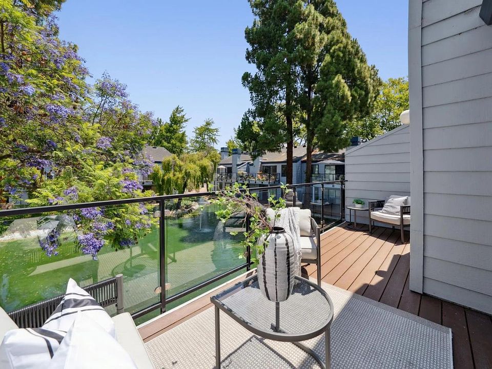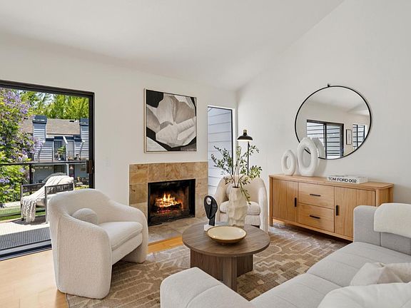 Located in the tree-studded community of The Waters, this top-floor unit at 905 W Middlefield #924 pairs updated interiors with peaceful pond views and a convenient Mountain View location. Vaulted ceilings and fresh paint enhance the open-concept living space, which includes a fireplace and a balcony with modern glass-and-metal railing. The refreshed kitchen features new quartz countertops, painted cabinetry, updated lighting, and stainless steel appliances, while the adjacent dining room features a striking modern chandelier. Two bedrooms enjoy southern exposure and leafy outlooks; the primary includes an ensuite bath with updated vanity, tile flooring, and lighting. The secondary bathroom mirrors these updates and sits beside the second bedroom. Other features include in-unit laundry, abundant storage, and new lighting throughout. A detached garage provides dedicated parking and storage. Enjoy community amenities including pool, hot tub, and tennis courts, plus proximity to parks, Castro Street, and Caltrain.