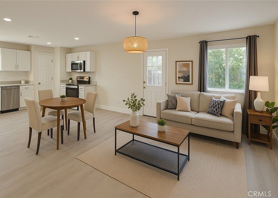 Beautifully updated inside and out, this townhome features fresh paint, new flooring, and modern fixtures throughout. The entry opens to a spacious front room that flows seamlessly into a bright great room with a comfortable living area, an inviting eat-in kitchen space, and a generously sized kitchen offering ample cabinetry. The laundry area is conveniently located at the base of the staircase.