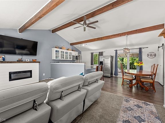 Welcome Home To This Beautifully Refreshed 3 Bedroom, 1.5- Bath Ranch Offering Comfort, Charm, and A Connection To Nature... Step Inside To The Inviting Open Floor Plan With New Carpet, Neutral Paint, And Durable LVP Flooring Throughout The Kitchen And Dining Areas... The Living Room Features High Ceilings With Striking Exposed Beams And A Cozy Custom Fireplace That Brings Warmth To Your Colder Evenings.. The Kitchen Is Both Stylish And Functional... It Boasts Crisp White Cabinetry, A Peninsula With Extra Seating, As Well As Generous Countertop Space.... All Appliances Stay Including A New Dishwasher... Down The Hall, You'll Find 3 Generous Bedrooms And A Full Bath... Outside, The Oversized Driveway Gives You Plenty Of Parking, While The Expansive Yard Provides Room To Roam... Enjoy Peaceful Creek Views From A Private Secondary Deck- Perfect For Morning Coffee Or Evening Relaxation... The Back Patio Adds More Outdoor Living Space, Ideal For Entertaining... Roof 2021 And So Much More .... Truly A Special Place To Call Home!!