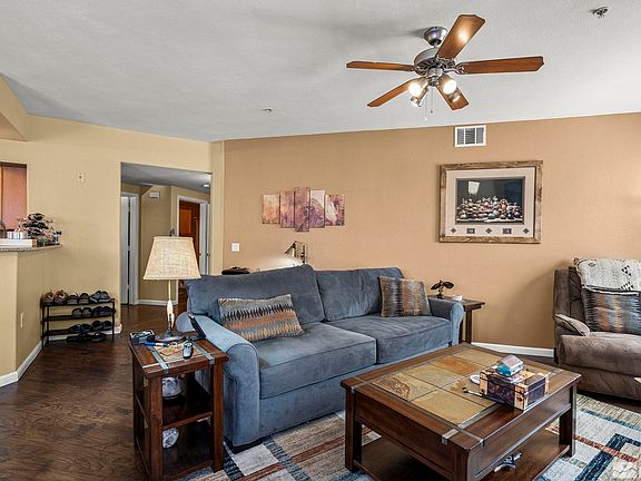 Welcome to this charming single-story 2-bedroom, 2-bath condo/townhouse, offering a perfect blend of comfort and style. This home boasts beautiful plantation shutters, sleek laminate flooring, and a cozy gas fireplace for those cooler nights. The large primary suite features a spacious walk-in closet and direct access to the patio, providing a peaceful retreat. The open kitchen is a chef's dream, complete with a breakfast nook, breakfast bar, granite countertops, ample cabinet space, and a pantry..., Enjoy the generous secondary bedroom, a large 2-car garage with additional storage room, and two private patios—one offering stunning mountain views and the other ensuring ultimate privacy. Situated in a quiet and secluded section of the community, this home provides access to incredible amenities, including a pool, hot tub, and snow removal services. The gated community also offers ample guest parking for your convenience. Don't miss out on this wonderful opportunity!