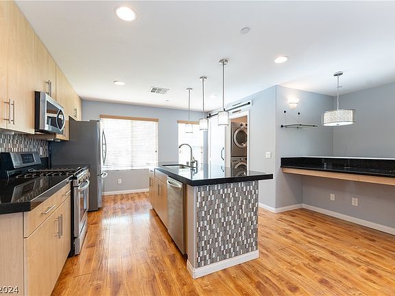 ATRACTIVE MULTI STORY GATED TOWNHOME. 1 BEDROOM WITH BATH DOWN. OPEN GREAT ROOM ON SECOND LEVEL. ISLAND KITCHEN WITH GRANITE COUNTERS, STAINLESS APPLIANCES, WINE FRIDGE, WALK-IN PANTRY PLUS LAUNDRY ROOM. 1/2 BATH DOWN. PRIMARY BEDROOM WITH CEILING FAN AND WALK-IN CLOSET. PRIMARY BATH FEATURES A SEPARATE SHOWER AND BATHTUB. 3RD BEDROOM WITH BARN DOOR, CEILING FAN PLUS WALK-IN CLOSET. FULL BATH IN HALL. 12X22 OPEN DECK WITH LAS VEGAS STRIP AND MOUNTAIN VIEWS. 2 CAR GARAGE WITH TANKLESS WATER HEATER.