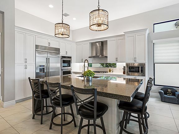 The properties sprawling great room showcases a built-in dry bar, complete with a split beverage refrigerator. With views of the expansive backyard, pool, and serene lake, this space provides a blissful sanctuary to escape the demands of everyday life.