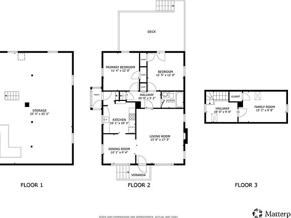 Two bedrooms are located on the main level, with a third bedroom upstairs for added privacy and flexibility.