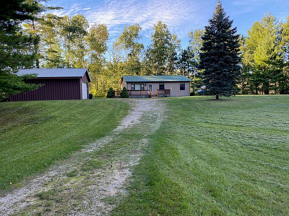 Charming 2 Bedroom Home on 3 Acres - Nestled on a wooded corner lot, this 2 bedroom, 1 bath home sits atop a ridge overlooking a beautifully manicured yard. The open layout includes a living room, kitchen, dining area, laundry, mechanical room, and a spacious walk-in closet in the master bedroom. Enjoy the outdoors from the wrap-around deck, perfect for relaxing and watching the wildlife. A 2-stall detached pole barn offers plenty of space for parking, a workbench, and storage for all your equipment. Hunters will love having Federal Land right across the road, and outdoor enthusiasts will appreciate being just minutes from area lakes and rivers. Whether you're looking for a year-round residence or an Up North retreat, this property has it all!