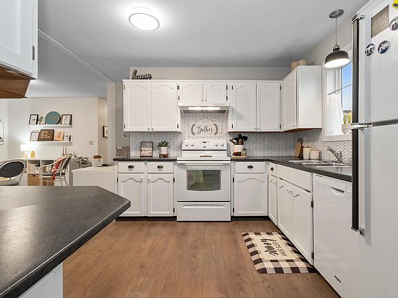 Bright, Clean Immaculately cared for home in Rainbow Estates. Light pours in this spacious open floor plan with a lovely dining area, a kitchen you will enjoy with ample cabinets & counters great for prep/baking. Family room has sliding doors opening onto 16x11 covered deck, private patio in back yard. 2 bedrooms, primary bedroom features large inviting ensuite with soaker tub. New windows, flooring, plumbing & paint. 2 storage rooms, new fencing in back yard. Parking for 3 & conveniently located across from Clubhouse. Complex offers RV parking, walking distance to hockey games & entertainment. Age 40+, 2 small pets allowed, no rentals.