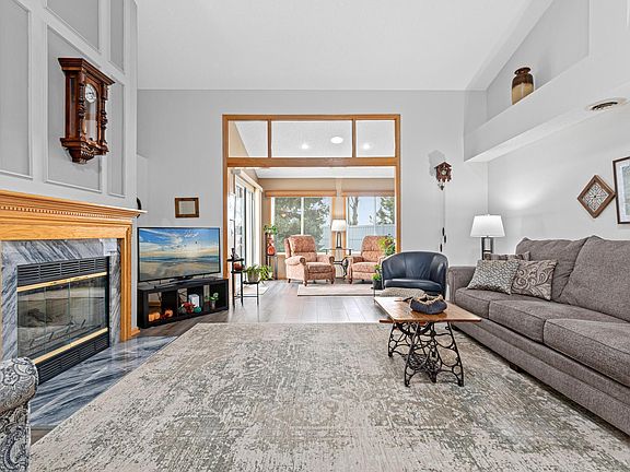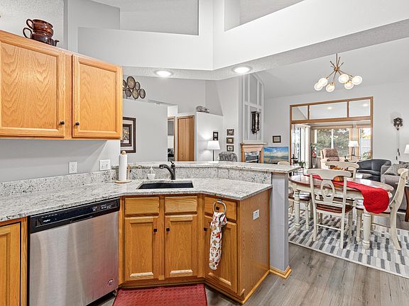 Desirable one level living in the Elm Creek Clubhomes community. Soaring vaulted ceilings and pristine luxury vinyl plank floors welcome you in. The open concept flows through the kitchen and dining areas to the spacious living room and sunroom. Who doesn't love an updated kitchen with an abundance of cabinets and granite countertops? Kitchen, living spaces, all bedrooms and laundry conveniently located on one level. Spend summer months enjoying the green space from your private patio complete with retractable Sun Setter Shade. Stay cozy this winter hanging out by the gas fireplace or watching the snow fall from the sunroom. Don't worry about the shoveling. Leave that to the association. Recent upgrades include LVP Flooring, fresh paint throughout, Furnace and A/C 2021, Granite kitchen counters 2021, Roll-in shower installed 2023, Gutter covers and Roof Heat Strips 2023 and new Washer/Dryer 2025. Location cannot be beat! Just minutes to dining, shopping, Elm Creek Park Reserve and freeway access.
