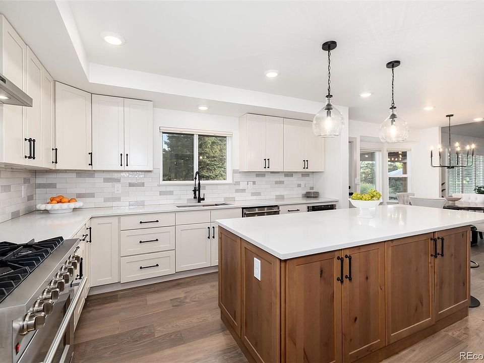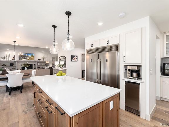 The main level showcases an open-concept design with hardwood floors and custom millwork, including board and batten details in the dining area. The gourmet kitchen is a standout with a 6-burner gas range, 60" built-in refrigerator/freezer, beverage fridge, quartz countertops, and a large island perfect for entertaining. The adjacent living area is filled with natural light and offers seamless flow throughout.