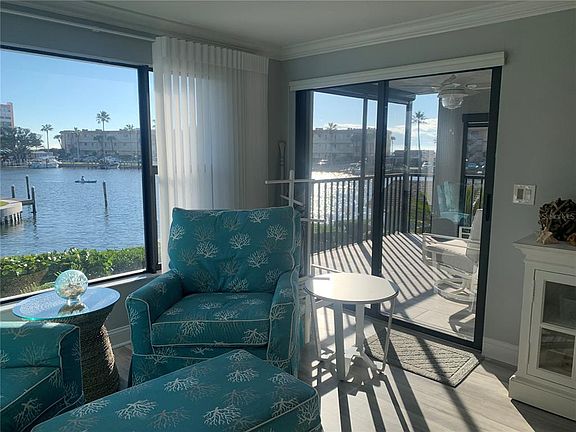 Gorgeous waterfront condo at The Moorings! You will love the view and the comforts of this well decorated condo in a coastal theme with a stunning view of Blind Pass Intercoastal and a partial view of the Gulf of Mexico just beyond. This community consists of just 17 condos and is on the quieter southern end of Siesta Key. Enjoy your private boat slip or just fish off the dock. Primary bedroom has customized storage and closet area and features a king-sized bed. Beautiful ensuite bathroom is remodeled and updated, as is the guest bath. This space also opens up to the screened in 12 x 10 balcony overlooking the water where there are usually kayakers and paddleboarders. The second bedroom has a queen and a twin bed. You will love the kitchen and eating your meals from bar area where you can view out your large living room window with electric shades. For your convenience, The Siesta Key Trolley, which is a constant running free "hop on" and "hop off" way to get to other areas on the Key, that stops right in from on Midnight Pass Rd. Repeat guest cannot return and this beautiful vacation property just opened up.