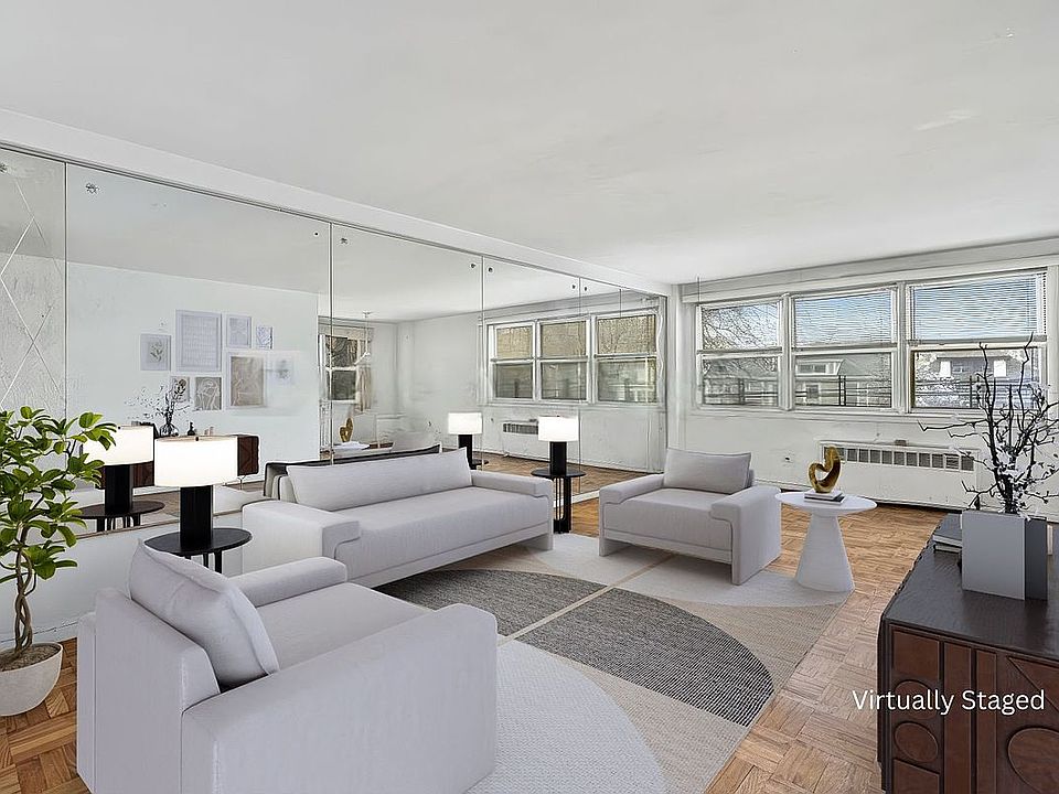 Welcome to this bright and spacious corner apartment, boasting east and south-facing exposures and a desirable junior 4 layout. With 800 square feet of living space, this home features hardwood floors, a generously sized bedroom, a separate dining area, and a large, functional kitchen—perfect for everyday living and entertaining. Storage is no issue here, with a large walk-in closet, two additional closets in the hallway and dining area, and two sizable closets in the primary bedroom—plenty of room for all your belongings. Enjoy low monthly maintenance of just $513, which includes all utilities—gas, heat, water, and electricity. Air conditioner usage is only $25/month per unit. Located in the well-maintained Justice Court co-op, residents benefit from an on-site laundry room, a live-in super, and an unbeatable location. You're just moments from the subway, shopping mall, restaurants, shops, and major highways—truly a commuter’s dream!
