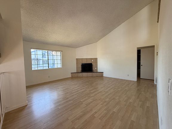 Inside, you'll find a bright and open layout with soaring ceilings, light wood-style flooring, and a cozy tiled fireplace in the expansive living room. The formal dining area sits just off the kitchen, which is complete with wood cabinetry, pantry, gas range, and dishwasher. The master bedroom boasts high ceilings, a walk-in closet, and a fireplace, while the second bedroom offers generous space with a ceiling fan. The bathroom includes double sinks, tiled counters, and abundant storage.