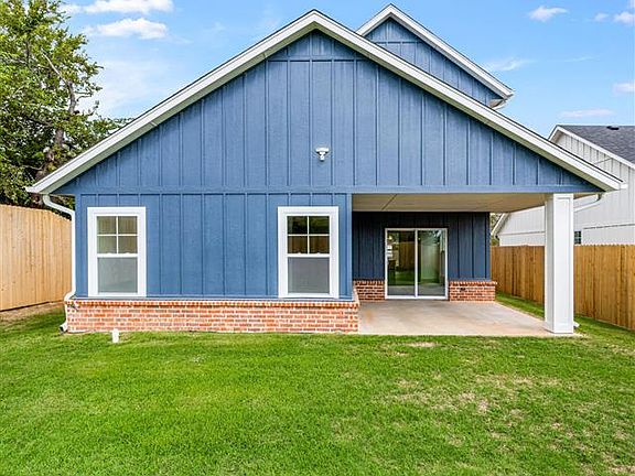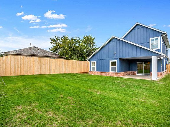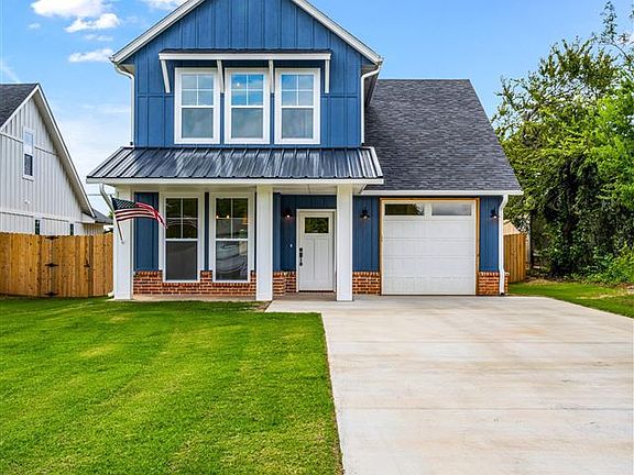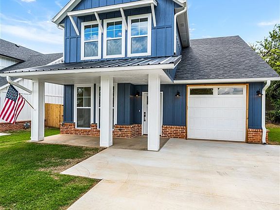 Welcome to this beautifully crafted modern farmhouse combining timeless character with today’s comforts. The inviting exterior showcases rich blue board-and-batten siding accented with crisp white trim, classic brickwork, and a welcoming covered front porch creating standout curb appeal. Step inside to an open, light-filled layout designed for both everyday living and entertaining. The spacious kitchen features custom wood cabinetry, sleek quartz countertops, a large center island, and pendant lighting that adds warmth and charm. Stainless steel appliances, a gas range with a pot filler, and a walk-in pantry elevate both form and function. The living area centers around a statement brick fireplace with a wood mantel—offering a cozy yet contemporary focal point. Neutral tile flooring flows throughout the main level, blending durability with modern style, while an open staircase leads to the private upstairs quarters. The primary suite feels like a retreat, complete with a spa-inspired bath featuring dual vanities, elegant arched mirrors, brushed brass sconces, and a large walk-in shower with marble-look tile and pebble flooring. Ample closet space and thoughtful finishes continue the home’s refined design. Step outside to the covered patio and enjoy a fenced backyard—perfect for morning coffee, cookouts, or playtime with pets. Additional features include a one-car garage, full gutters, tankless hot water heater and clean, modern trim details throughout. Perfectly located close to Elgin Public Schools. This home blends style, comfort, and craftsmanship in every detail. Call Misty Julian, Listing Broker at 580-656-1909 for more details.