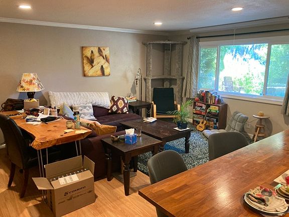 The house: spacious living room, kitchen(two fridges, gas stove, no dishwasher), dining room with working fireplace, craft room, and garage with laundry annexe(with washer/dryer and sink). 3 bedrooms and 2 bathrooms in the main house, plus additional dwelling unit in the back yard with separate bedroom and bath. Raised garden beds, shady back patio, lawn and chicken coop. Quiet neighborhood across the street from a park, and 5 min bike ride to Safeway and Nugget.