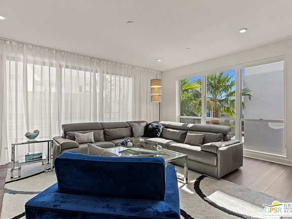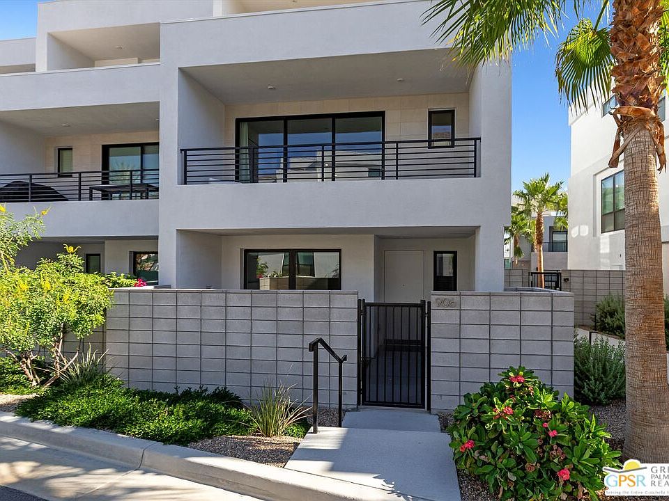 This stunning, highly upgraded condo in the desirable gated community of Cody Place offers the perfect blend of modern design and resort-style living; all framed by spectacular San Jacinto mountain views. As an end unit, this home is bathed in natural light with additional windows throughout, creating a bright, airy, and inviting atmosphere. The spacious great room and dining area are anchored by a gourmet kitchen featuring an oversized island, full-height cabinetry, stainless steel appliances, and quartz countertops with custom tile backsplash. Expansive sliding panel doors open to large covered balconies on both sides, seamlessly blending indoor and outdoor living and capturing breathtaking views from every angle. Upstairs, the primary suite serves as a private retreat with its own covered balcony and a spa-inspired bath with a generous walk-in closet. The upstairs den or office also opens to another covered balcony with unparalleled mountain and city views. The lower level features a private ensuite guest room with access to a secluded patio. Additional highlights include owned solar panels, porcelain tile and luxury vinyl plank flooring, and an attached two-car garage. Residents of Cody Place enjoy a beautifully designed clubhouse, two pools and spa, outdoor lounge and fire areas, BBQ, and a dog park; all within a secure, gated community that truly embodies Palm Springs resort living.