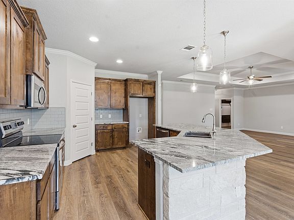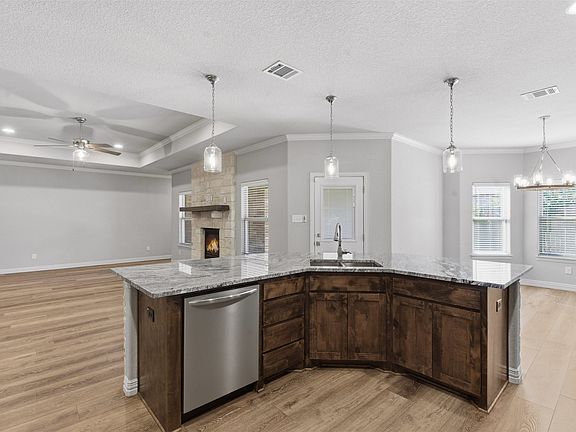 Discover a blend of style and comfort in this exquisite 4-bedroom, 2-bathroom home located in the heart of Cleburne, TX. This residence captivates with its exceptional curb appeal, featuring an attractive mix of brick and stone craftsmanship complemented by meticulous landscaping. A taller wood front door invites you into a harmonious living space designed for modern living. Step inside to find an open-concept layout adorned with laminate wood flooring throughout the main areas, offering both durability and elegance. The living room is a cozy haven highlighted by a large stone fireplace, perfect for gathering with loved ones. The heart of the home, the kitchen, boasts a substantial granite island, ideal for culinary adventures and casual dining. Complementing this space is a quaint breakfast nook and a convenient doggy door leading to the backyard, ensuring every family member is catered to. Retreat to the primary suite, featuring a luxurious bathroom with a large soaking tub, separate shower, dual sinks, and expansive his and her closets. The split bedroom arrangement promotes privacy, while the remaining bedrooms are comfortably carpeted. The guest bathroom presents a shower-tub combo and a large vanity, providing practical elegance. Exterior details accentuate the home's charm. The backyard is an oasis of its own, with maintained personal landscaping and strategically placed lights that create an enchanting evening atmosphere. Enjoy outdoor relaxation and entertainment on the covered back porch, complete with a sprinkler system to keep the greenery lush.