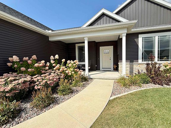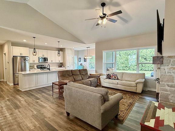 Newer 3 BR, 2-bath ranch-style home in Brownsville features an open concept with a vaulted ceiling in the Great Room and a stone gas fireplace. The spacious kitchen boasts a large island, pantry closet, stainless appliances, quartz countertops, and custom white cabinetry. White doors and trim throughout. Primary suite includes a tray ceiling, walk-in closet, double vanity, and walk-in shower. LVP floors. Main floor laundry. Covered porch off the dining area. Egress window & rough-in for future bath in lower level.