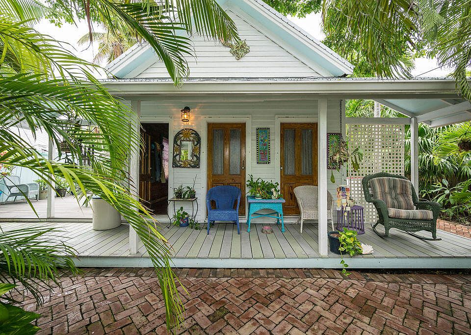 OLD TOWN KEY WEST! This home is the quintessential Key West colorful island home. Owner occupied and well maintained, first time on the market in over 20 years. Old Town home with rare large 51x94 lot! Main level primary bedroom with en suite bath. Upper level bedroom with en suite bath and spacious balcony with tree top views. Detached guest cottage bonus space for home office or artist studio. Home features Dade County Pine, hardwood floors, French doors, indoor/outdoor living and more! This is the perfect home for entertaining with garden patios and deck spaces, & covered porches all opening to the beautiful saltwater pool.Privacy fence surrounds the home and tropical garden areas. Roof 2020. Hurricane Rated Fabric Shutters. Possible parking on rear of property for small auto. Whole house generator.