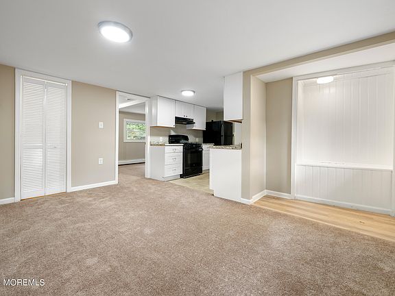 The home's living spaces flow seamlessly from room to room, with plenty of natural light flooding in through large windows. The kitchen is updated with sleek white cabinetry, granite countertops, and modern black appliances, including a gas stove. Adjacent to the kitchen is an open dining or additional living area, providing flexibility in how the space can be used. The bathroom features modern fixtures, a combination of tiling, and bright windows that make the space feel fresh and clean. The bedroom has ample closet space and neutral tones that create a calming environment.