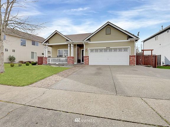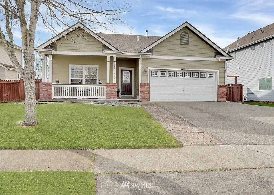 Beautiful rambler in Village Green. Over 1,500+ w/ 3 bedrooms & 2 bathrooms. Large kitchen with island, Silestone counters & built in desk with extra cabinets. Gorgeous hickory hardwood flooring. Vaulted Primary suite with walk-in closet & full bath w/ double vanity. A/C, 9 foot ceilings, gas fireplace, Mt Rainier view. Sitting on a large nearly 1/4 acre lot you'll find an extended patio, beautiful landscaping, and a spacious shed with electricity. Fully fenced & backs up to open space for great privacy!