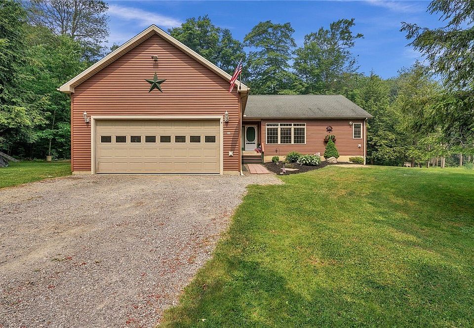 Over 5 wooded acres surround this beautiful 3 bedroom 2 bath ranch with attached garage. A patio & covered porch with firepit area overlooks the pond. Homeowners are just putting the finishing touches on so many updates. The kitchen features new quartz countertops, stainless sink, lighting & tile backsplash! Oven/range & microwave just purchased! New laminate flooring throughout much of the home & carpeting in the bedrooms was just installed. The interior was just freshly painted! Both full baths are renovated too! The combination living/dining room has new electric fireplace & cathedral ceilings. The master bedroom has French doors to a covered porch, private bath with whirlpool tub & walk in closet. The full partially finished walk out basement has glass block windows & double doors to outside, plus a bonus room. The yard has blackberry & raspberry bushes, flowering chestnut tree, Japanese maple & a shed that was used to make maple syrup. Plumbing is installed in basement for a 3rd bathroom. Attached garage is insulated & heated. The pond is 18 to 14 ft. deep & stocked with largemouth bass, blue gills & enough minnows to flourish & new aeration system was installed last year.