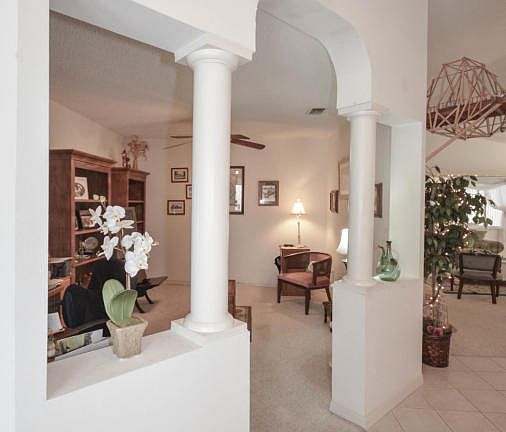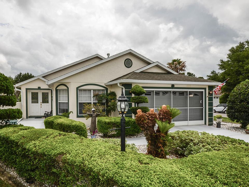 Large corner lot with deep space out back. This spacious expanded Quincy model home is located in the much sought after gated 55+ golf community of On Top of the World. Home features 2 bedrooms, 2 baths, 2-car garage, library, large Lanai under heat and A/C, split bedroom floor plan, double door entry with true foyer, open concept living/dining/kitchen, laundry room, HVAC (2017), professional landscaping, and more! Lawn care, basic cable, gym, exercise classes, 24-hour guarded gate, and more are included in your monthly amenities fee. The open floor plan features a double-door tiled entry foyer with hallway leading past the columned library to the expansive vaulted Great Room with combined Living, Dining, and Kitchen. Kitchen features a curved island with eat-at bar-height counter........