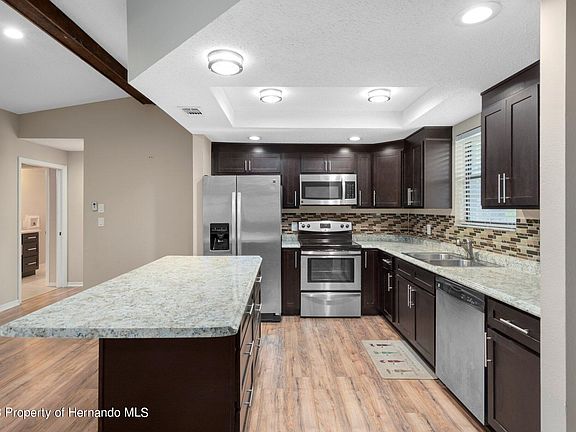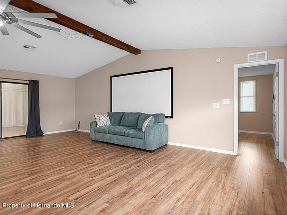 Nestled in a serene neighborhood with NO HOA, this exceptional 2-bed, 2-bath home in Spring Hill beckons with its inviting open floor plan and convenient split-bedroom layout. Eligible for conventional, FHA, and VA financing, this move-in-ready gem boasts a covered walkway to the front door, situated on a sizable lot and featuring updates such as a newer roof, HVAC, garage door, laminate flooring, and stainless steel kitchen appliances - all meticulously upgraded in 2017. The spacious 2-car garage, equipped with a workshop area, complements the property's modern features, including a glass-enclosed back porch ideal for entertaining. The living room, adorned with high vaulted ceilings and a beautiful wooden beam, seamlessly connects to the open kitchen and dining area, showcasing contemporary design elements. Revel in the kitchen's tall cabinets reaching the ceiling and a generous island perfect for culinary endeavors. The Master Suite provides a private retreat with an attached bathroom and sliders leading to the oversized, enclosed porch. Conveniently located less than 20 minutes from Weeki-Wachee Springs State Park and within 15 minutes of the Suncoast Parkway, this residence offers an idyllic blend of comfort and accessibility. Act swiftly - this opportunity won't last!