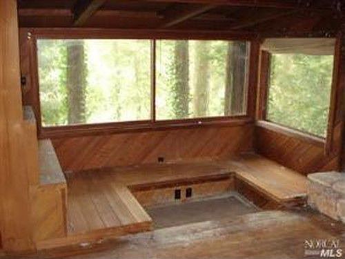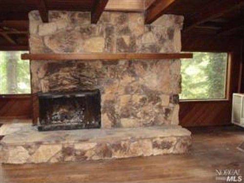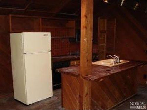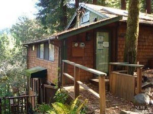 While this property needs work, it has stunning views off two large private decks in back. Nestled in the hills above Monte Rio, this rustic home has a large living area with a stone fireplace in the center and a deck with a hot tub. Living area with kitchen downstairs. At this price, it is an outrageous deal!