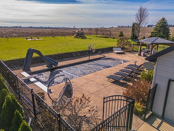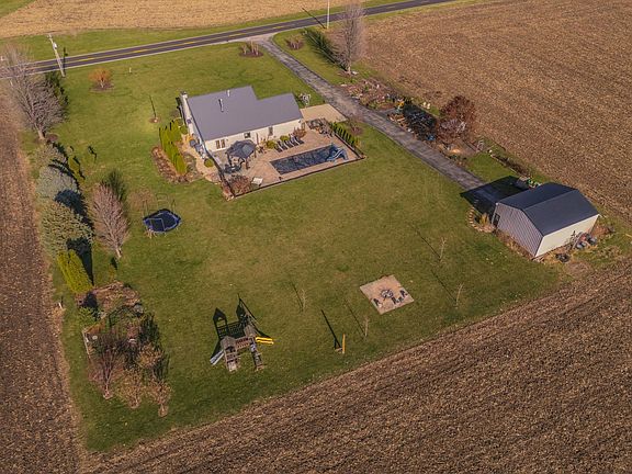 Make your 2025 goals come true with a beautiful piece of paradise close to town in North Norma! Wonderful home on 1.76 acres with a machine shed (31 x 25) with 8ft. overhead door, recently spray foamed interior and gas heater hookup with propane. Inground saltwater pool with pool heater and motor replaced in 2021, new salt generator in 2022, and new pool cover in 2024. Hot tub will remain along with trampoline, playground equipment, chicken coup, gazebo, iron arbor, cabinets in the shed and garage. Are you ready to have chickens and plant a garden? So many perennials throughout the landscaping, plus apple and peach trees, raspberries, blackberries, and strawberries! The property offers a natural gas line to the home, a metal roof and a generator serviced yearly. The well is 138 Ft. deep. The covered front porch awaits you at the end of the lane with an attached oversized garage with bump-out and plumbed for gas heater. The spacious interior features and expansive living room with an appointed fireplace to cuddle up during the cold! You will melt with the views of the pool from the dining area that opens from the living room to the kitchen. Newer luxury plank flooring throughout the main floor and updated white kitchen cabinets. Fantastic pantry space, and double ovens. (All appliances stay including washer and dryer). First floor laundry is located conveniently off the kitchen. Primary bedroom has long windows overlooking the north view of the property and has an updated bathroom with double vanity sinks, tiled walk-in shower, new lighting, and walk-in closet 2023. Upstairs brings 2 more bedrooms, a full bath with double sinks, and office/nursery bonus room! The basement is finished with an L-shaped family room, and another full bath with double sinks. Large Storage room with mechanicals. Water softener is owned. Make it your next chapter!!!
