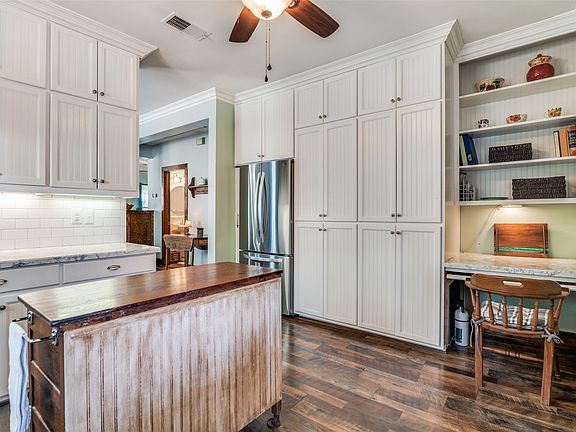 BRAND NEW LISTING nestled in beloved Historic Downtown McKinney! Step into timeless charm and cozy elegance in this beautifully cared-for home. Mature trees, thoughtful detail, and custom woodwork create a storybook setting at 907 Hill Street. This welcoming front porch invites you to slow down and sip your favorite drink where you can enjoy the peaceful quiet this area offers. No HOA! Inside, elegant crown molding and handsome LVP flooring offer a seamless flow from the living areas to the dining area—ideal for gatherings or quiet evenings in. The heart of this home is the delightful kitchen, which shines with impressive custom white cabinetry, tile backsplash, a desk nook, charming open shelving, stainless steel appliances, beautiful counters and a large single-basin sink beneath a sunny window. Some notable hard-to-find features are the generous TWO primary bedrooms, with one offering the potential to be transformed into two spaces. The main primary bedroom offers a spacious closet, a treat for a mature home. Enjoy having your own two-car garage! The spacious backyard area has so much potential and leads to this quaint hobby shed. This inviting home is a rare blend of vintage charm, character, and tranquility—this treasure is ready to welcome you home.