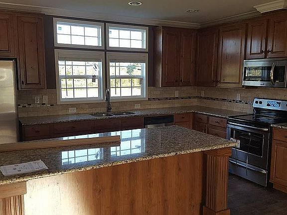 MODULAR CLAYTON HOME ON CEMENT FOUNDATION WITH CITY WATER AND SEWER. ALL UPGRADES, INCLUDING WOOD CABINETS, GRANITE COUNTER THROUGHOUT HOUSE, FANS IN EVERY ROOM, RECESS LIGHTING. OPEN FLOOR PLAN, TWO DRIVEWAYS, BIG POND WITH TREES AND FISH AND TWO DOG KENNELS. BIG COVERED DECK PATIO ON REAR WITH VIEW OF THE POND. NEW AIR CONDITIONING UNIT, NEW CARPET IN LIVING ROOM. FRESH PAINT OUTSIDE AND ROCK WORK. ABOVE GROUND STORM SHELTER, SHED AND CARPORT WITH GARAGE ALL STAY WITH HOUSE. CONCRETE SIDEWALKS.