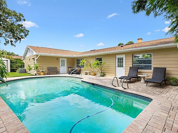 WELCOME HOME to this beautifully maintained 4-bedroom, 3-bathroom home offering 2,208 SF of versatile living space, including a 448 SF in-law suite with a private entrance—perfect for rental income, multi-generational living, or a private guest retreat. The in-law suite is complete with tile and carpet, its own bathroom, and living area with pool access. You will definitely enjoy the resort-style backyard oasis with a sparkling pool, paver patio, and lush tropical landscaping—an ideal spot to relax and catch breathtaking sunsets at the end of the day. Step inside the main home to find timeless terrazzo floors, 3 bedrooms, 2 bathrooms, dining room, living room, den and a beautifully remodeled kitchen perfect for the Chef of the house. The kitchen features rich cinnamon-colored cabinets with black glaze trim. A big plus is the spacious 4x8 cooking island with lower storage and pot drawers. There is a double-door pantry, tons of storage, hi-def laminate countertops and stainless steel appliances. Roof was replaced in 2022. The property also features handicap accessibility, block stucco construction, fenced yard, storage shed and curb appeal galore with beautifully manicured landscaping. Located just steps from Lake Griffin, where you can fish, canoe, kayak, stroll by the water, or sip your morning coffee watching the sunrise. There's also a park with a playground. This is a perfect place to bring your chairs to watch the space shuttles! You will love the convenient access to shopping, schools, public transportation and so much more. This charming home has great bones, tons of character, and endless potential—a must-see! Call Me Today for a Private Showing. You will be impressed! NOTE: CHANDELIER IN DINING ROOM AND FOYER DO NOT CONVEY. POTTED PLANTS AND ROCKS AT FRONT DOOR AREA DO NOT CONVEY.