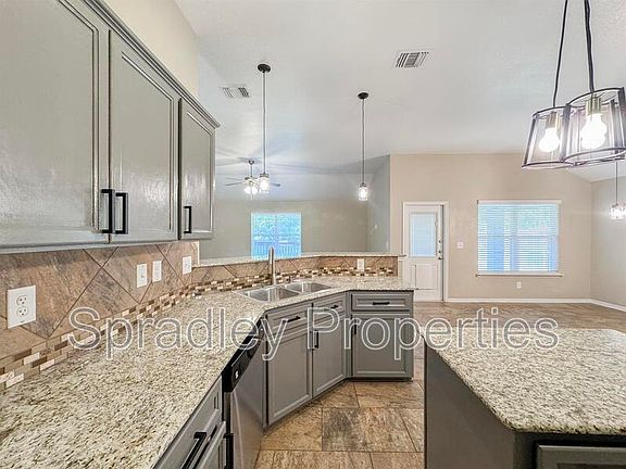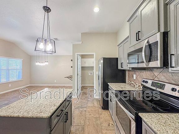 Spacious 3 bedroom, 2 bath home with 1,808 sq. ft. of living space. This property features an open floor plan with high ceilings, tile flooring in main areas, and carpeted bedrooms. The kitchen is equipped with granite countertops, stainless steel appliances, an island with bar seating, and ample cabinet storage. The master suite includes a large walk-in closet, dual sinks, soaking tub, and a separate walk-in shower. Additional highlights include a dedicated laundry room, modern light fixtures, and multiple storage options throughout. Exterior features a fenced backyard and attached garage. Leases are required to participate in a Resident Benefit Program at a monthly cost of $30.00. Renter's Insurance is required. *Fees for Resident Benefit are not included in the rent amount shown.* Availability dates are estimates and subject to change without notice. Rental prices may change without notice unless applicants have signed a lease agreement. Photos shown may be prior to our current resident.