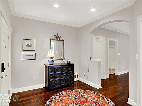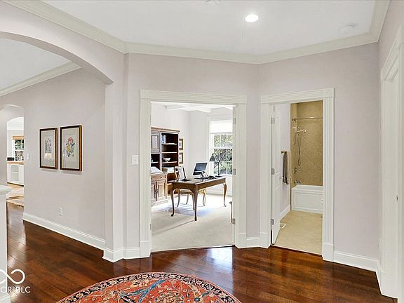 This exquisite property boasts luxury and functionality at every turn. Situated on a serene .23-acre lot with a picturesque tree-lined backyard, this meticulously crafted residence offers unparalleled comfort and style. Stunning architectural details throughout this beautiful home include 9-foot ceilings, crown molding, coffered ceiling, and arches. As you walk through the home, experience the elegance of distressed cherry wide plank flooring and porcelain tile floors, complemented by solid core doors. The heart of the home is the stunning gourmet kitchen, where custom Mouser maple painted cabinetry, granite countertops, weathered, hammered copper farm and prep sinks, and antique bronze hardware create an atmosphere of timeless elegance. Whip up culinary delights with ease using the Wolf 6-burner gas cooktop and built-in double ovens, integrated dishwasher, and a Sub-Zero refrigerator. The large kitchen island is complete with a teak countertop, prep sink, and beverage fridge. The kitchen is open to the casual dining area/sunroom, surrounded by windows and offering views of the lush backyard and access to the deck. The spacious living room features a gas fireplace with a marble surround and natural light. The home has two primary suites: one on the main level and the 2nd one taking up the entire upper level. Each suite includes custom California-style closets and air jet tubs in its respective full baths. Both offer nice privacy. The main level also provides an office with a stunning coffered ceiling and a guest bedroom, a full bath, and a laundry room complete with a washer & dryer, storage, and a utility sink. The walkout lower level is an entertainer's paradise, complete with a wet bar, kitchenette, game room, large family room, media room, workshop, 4th bedroom, storage, and full bath. Access from the lower walkout to the covered patio provides the perfect spot for outdoor gatherings, while the Trex deck off the main level offers space for al fresco dining or si