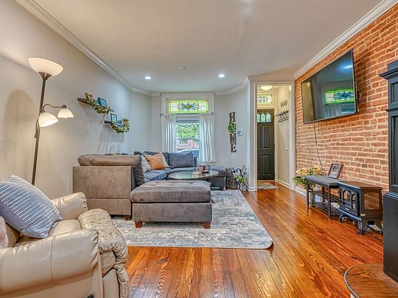 Tree-lined one-way streetWalk-in cedar closetHardwood floorsCrown moldingStainless steel appliancesExposed brick wallStained glass windows